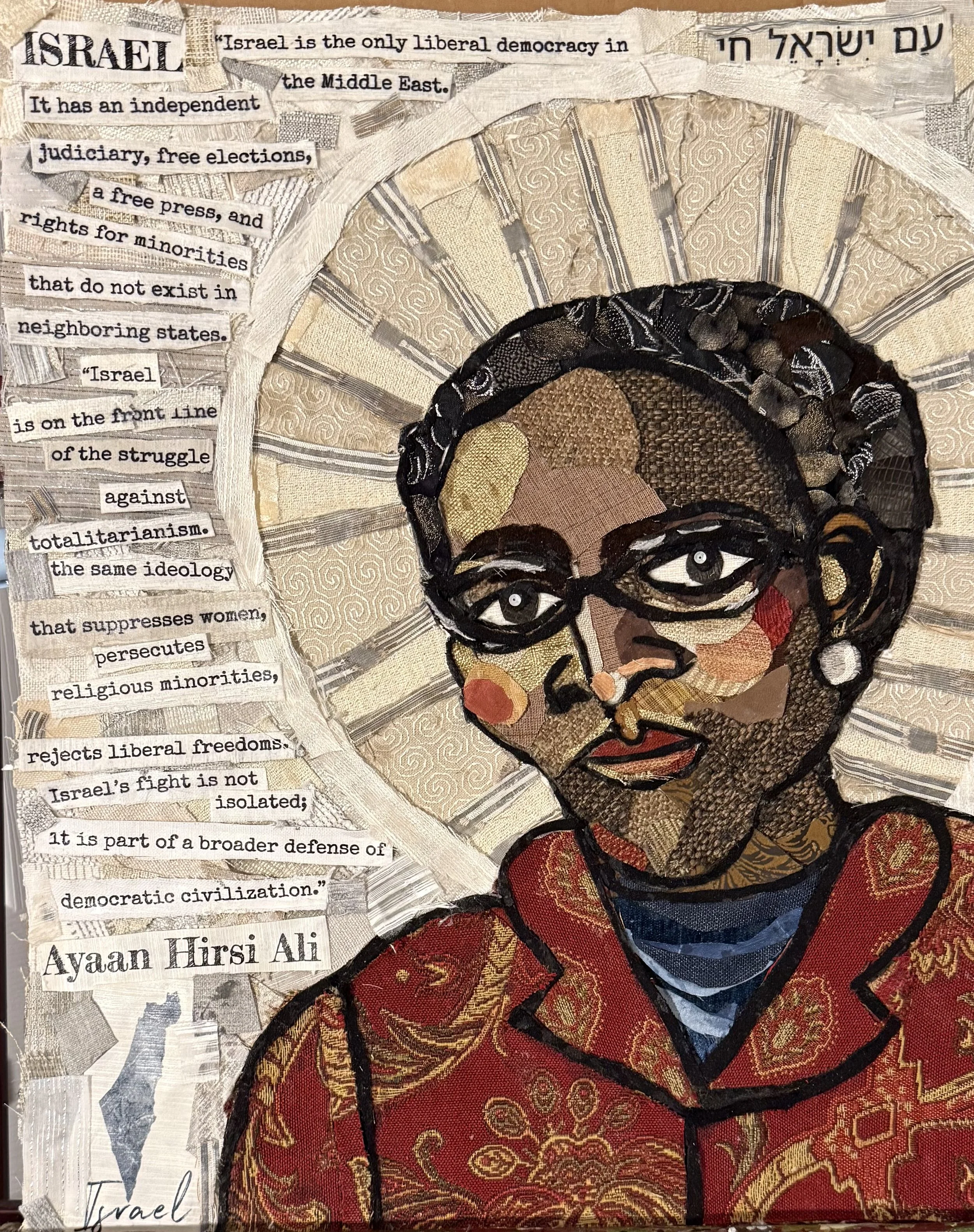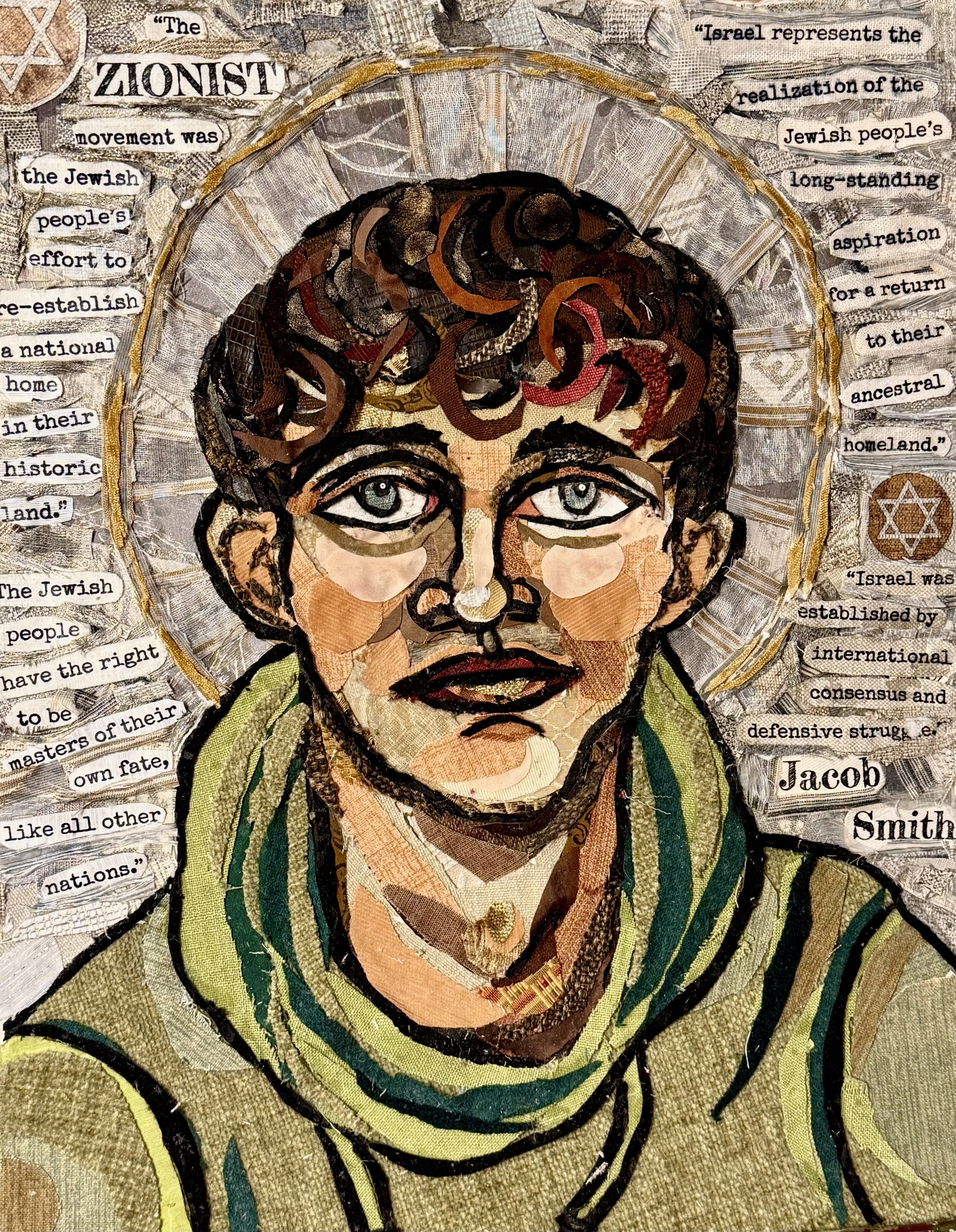 The Upstanders is a series of fabric assemblage portraits honoring individuals who choose to stand up and speak out against antisemitism and hatred in our own time. While history remembers the Righteous Among the Nations, gentiles (non-Jews) who risked their lives to protect Jews during the Holocaust—this series recognizes contemporary voices who demonstrate similar moral courage by publicly defending the Jewish people and confronting antisemitism.